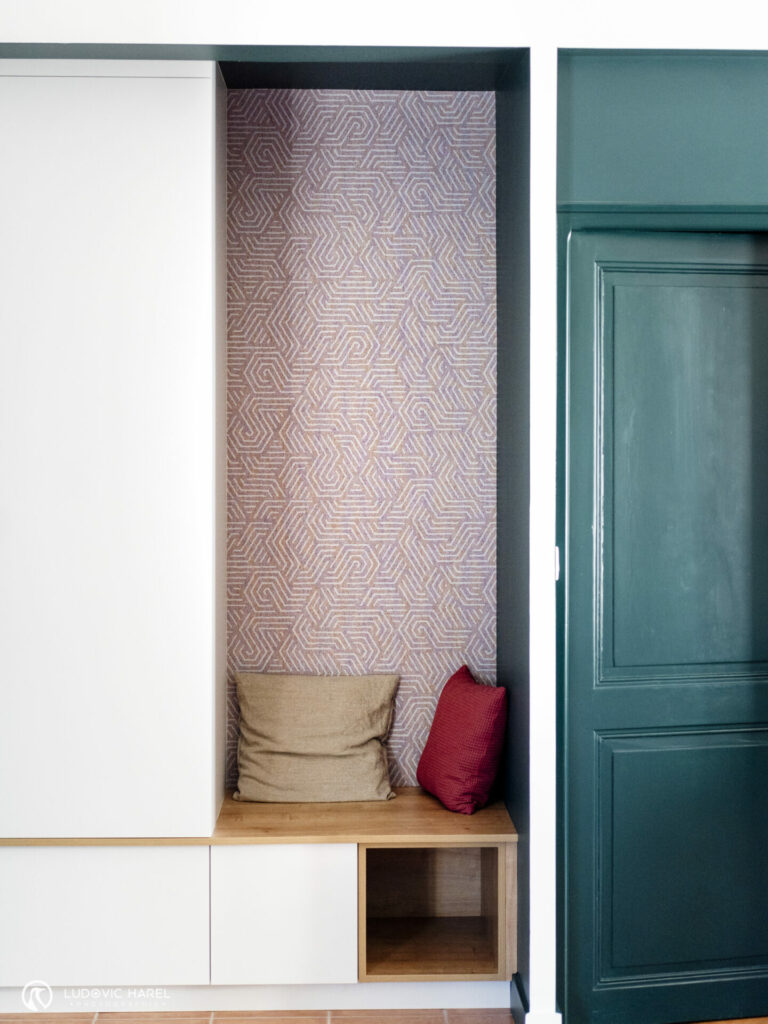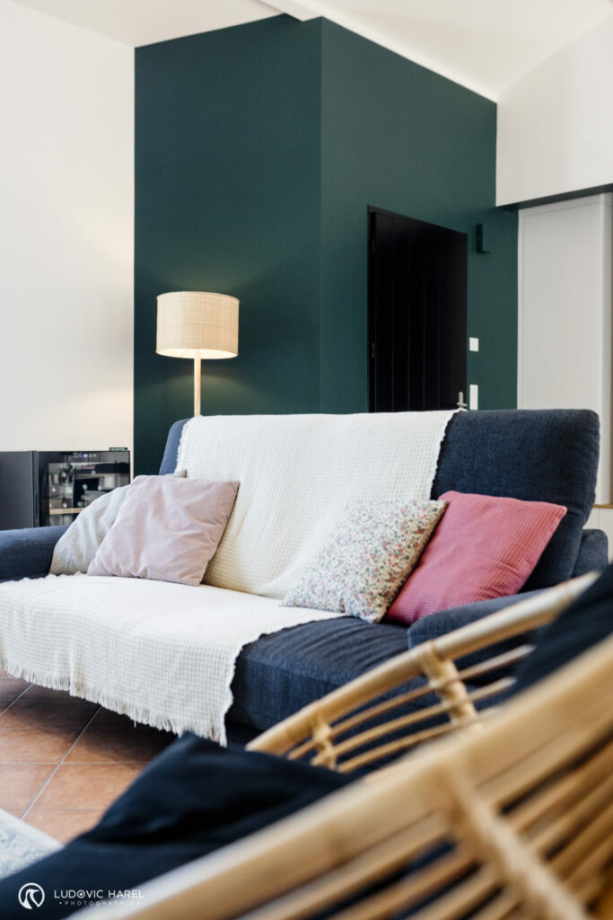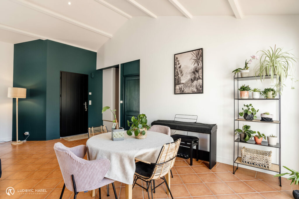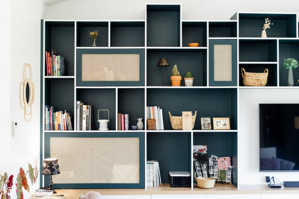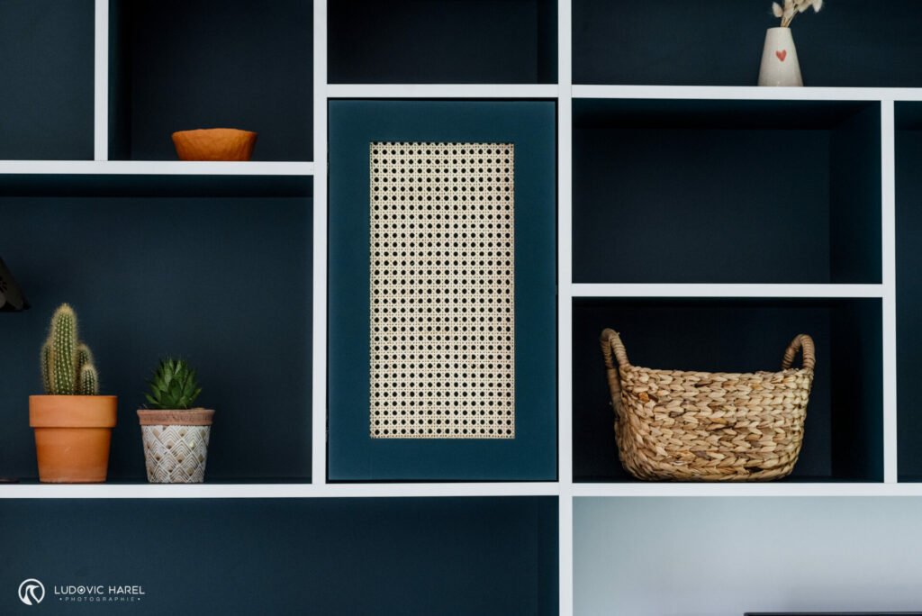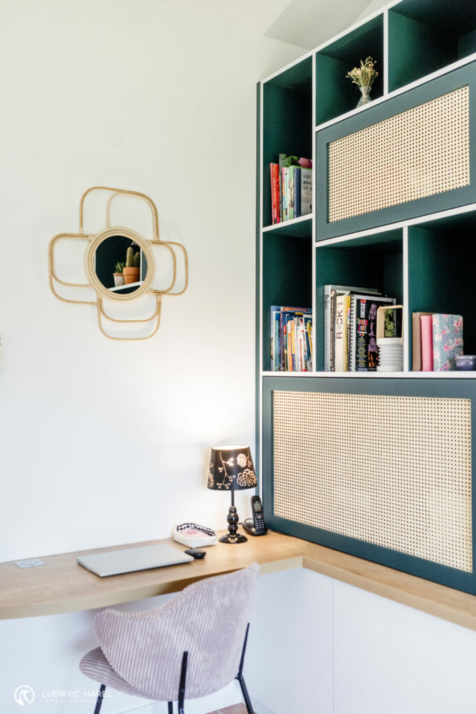 C’est chose faite avec ce grand meuble sur-mesure qui sert à la fois de buffet, bibliothèque, bureau et meuble TV. Il y a même la machine à coudre qui s’est cachée dedans ! C’est la pièce maîtresse de cet espace. Nous avons joué sur le côté graphique en mettant les chants en blanc, cela permet également d’alléger le meuble car le reste est en vert très soutenu. Le cannage vient réchauffer l’ensemble ainsi que les chaises en velours, les éléments en rotins et le sol que nous avons conserver.