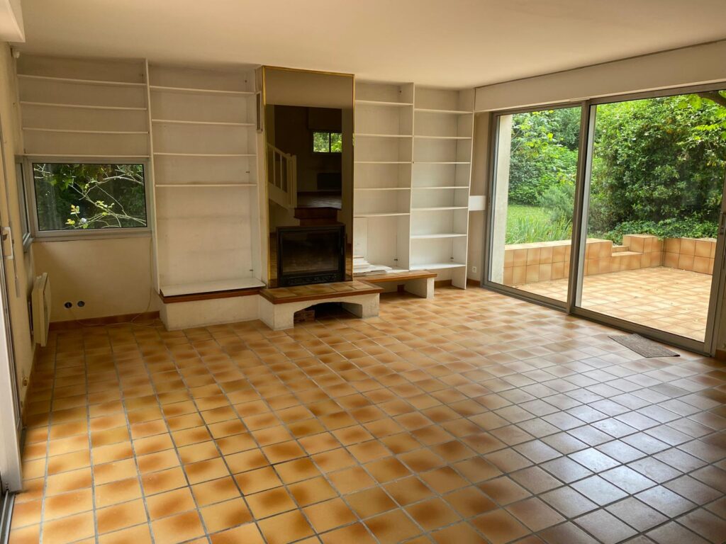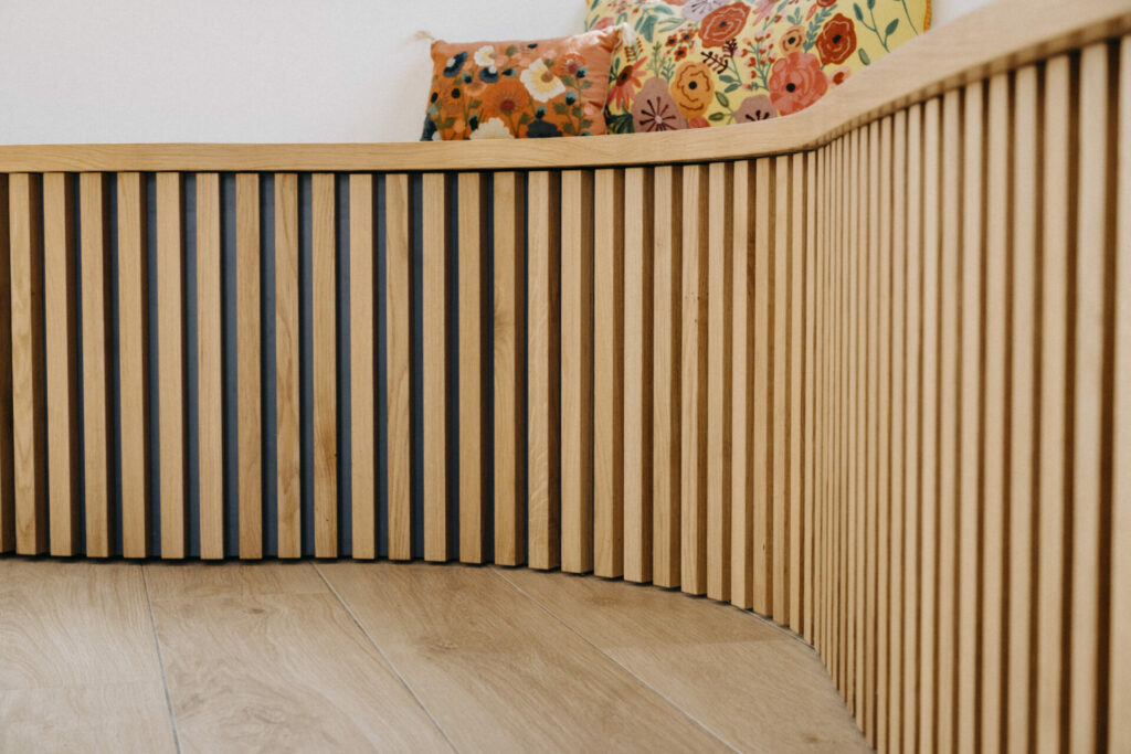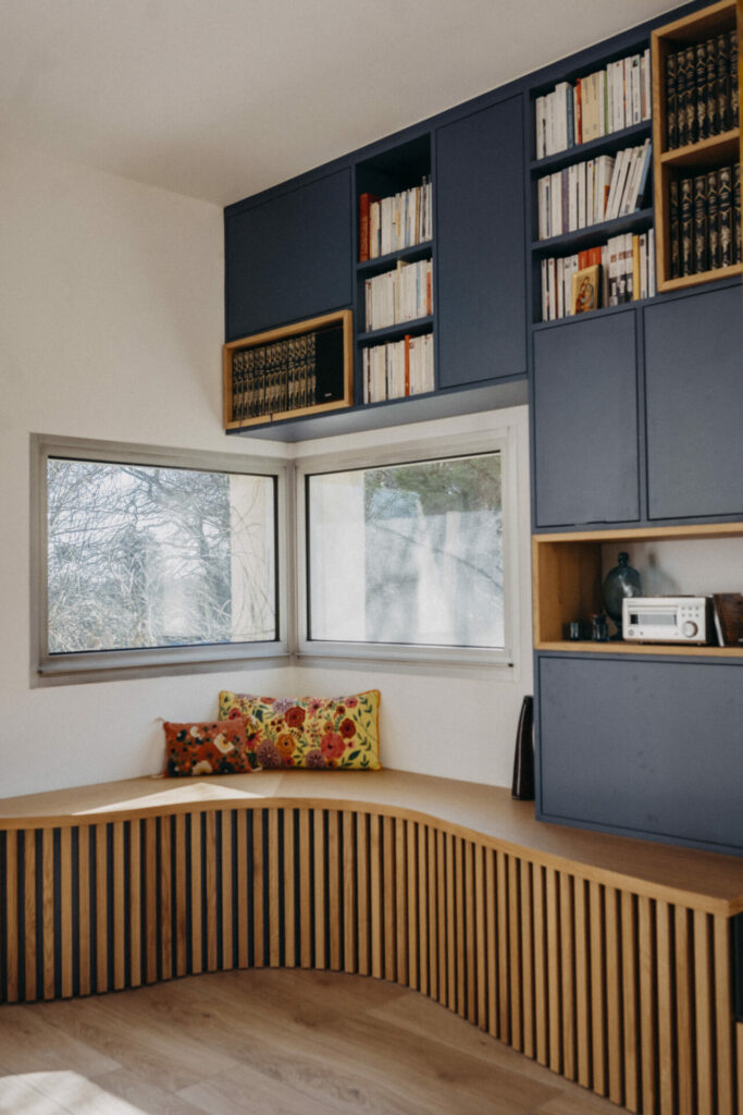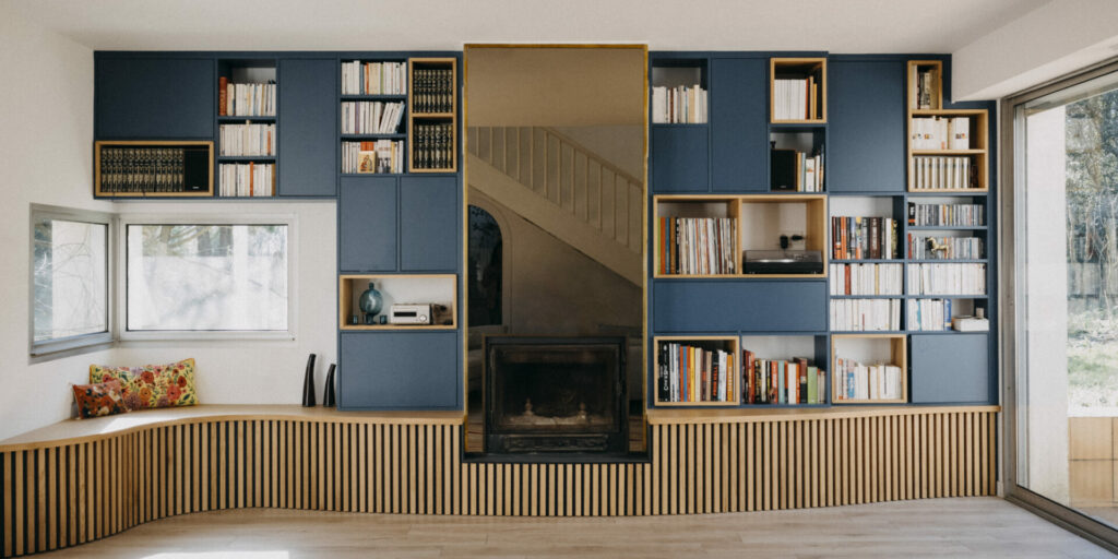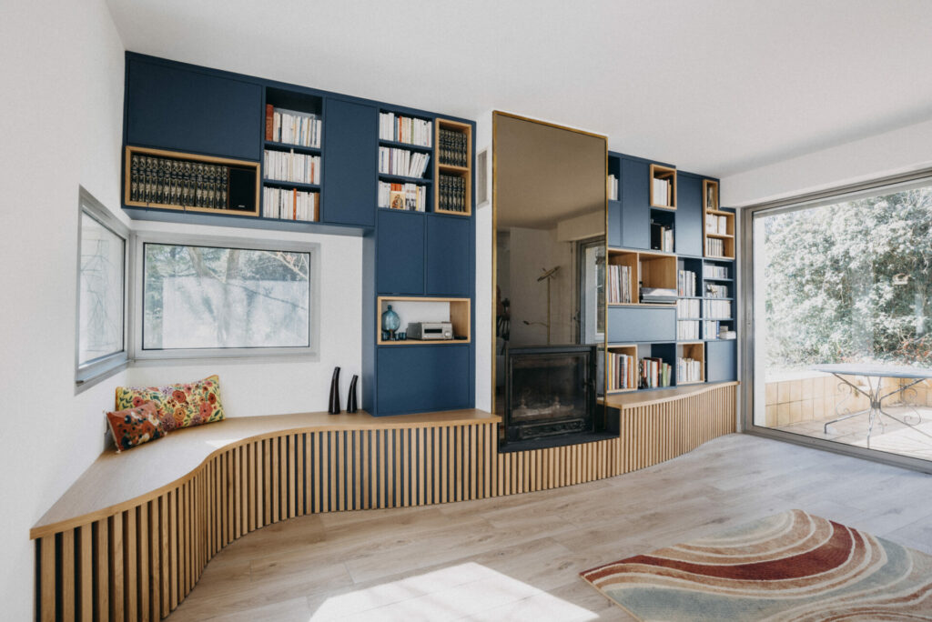 PROJET : Réalisation d’une bibliothèque sur-mesure pour cette ancienne maison d’architecte. Nous avons fait le choix de garder la cheminée avec ce grand miroir qui apporte du cachet et de donner une vrai identité à la pièce. Pour casser avec les lignes de ce type de maison, nous avons joué sur les courbes avec un soubassement en tasseaux pour rendre l’ensemble plus doux et contemporain.