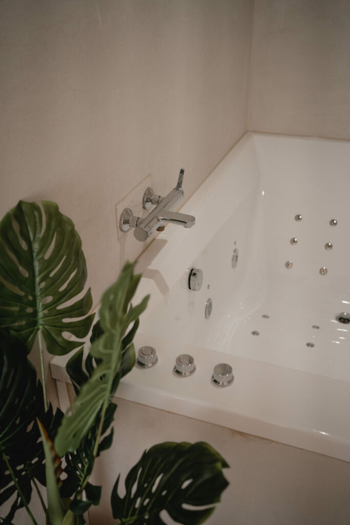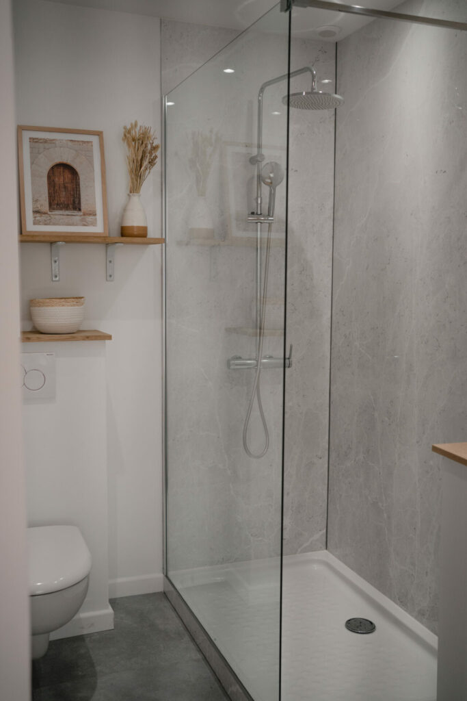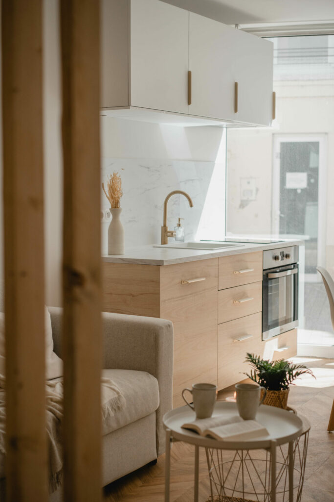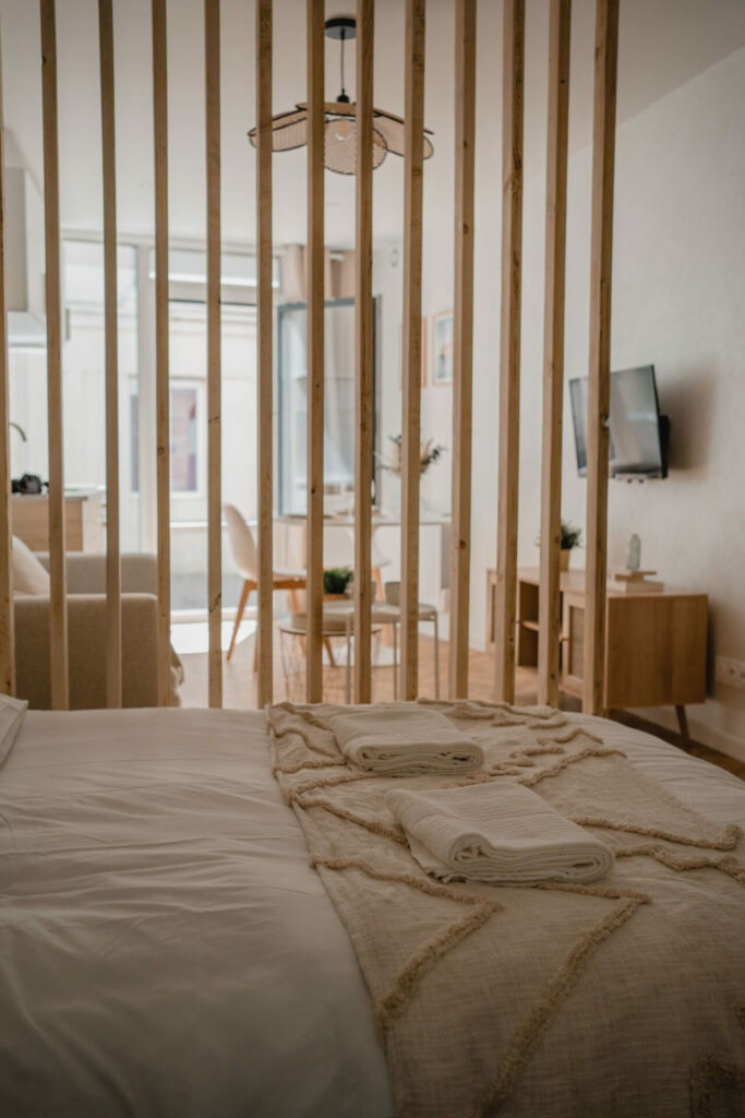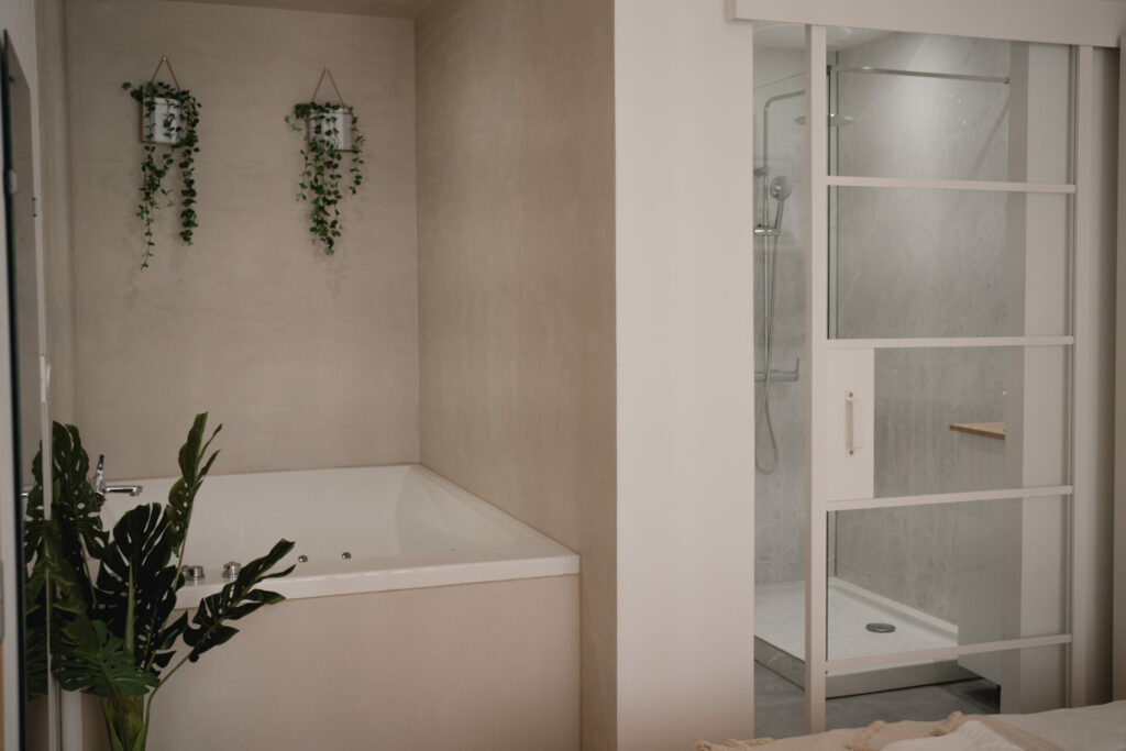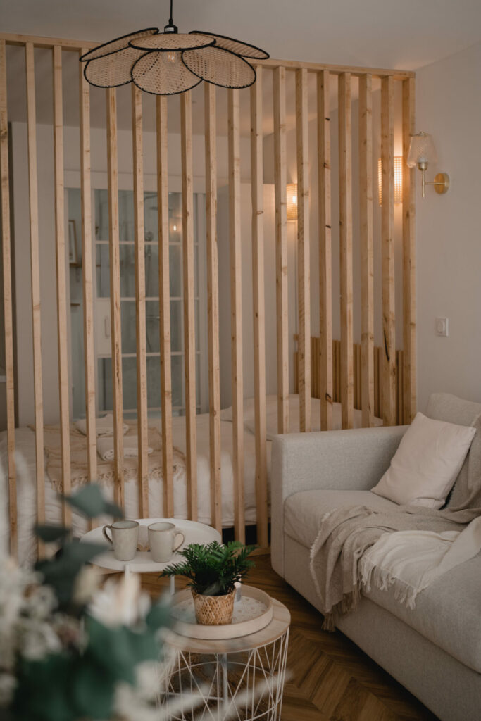 Un vrai défi de tout faire tenir dans 25m2 mais on y trouve un salon/salle à manger, une cuisine, un espace nuit, une salle de bain ET un spa ! . Une décoration naturelle, bohème avec des matériaux comme le bois, enduit à la chaux, couleurs douces et le côté chic avec l’imitation marbre et le parquet en chevron. Malgré un petit budget, nous avons réussi à donner une vrai identité à ce lieu !