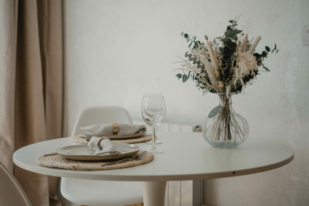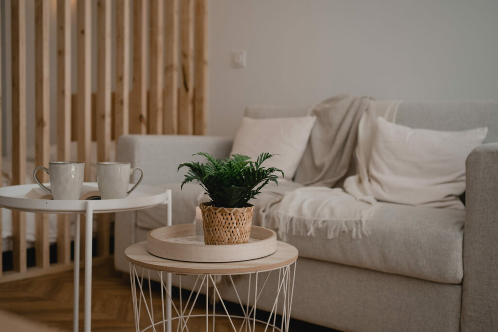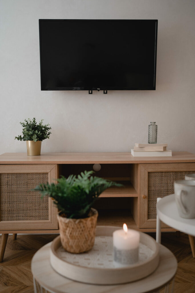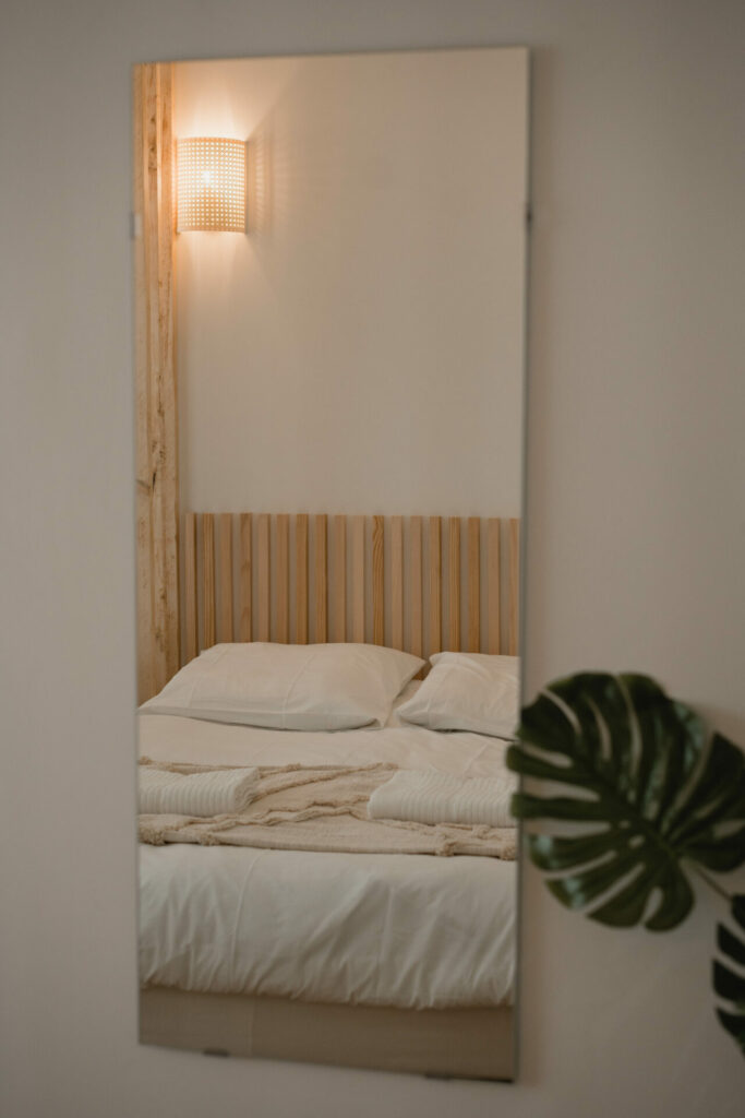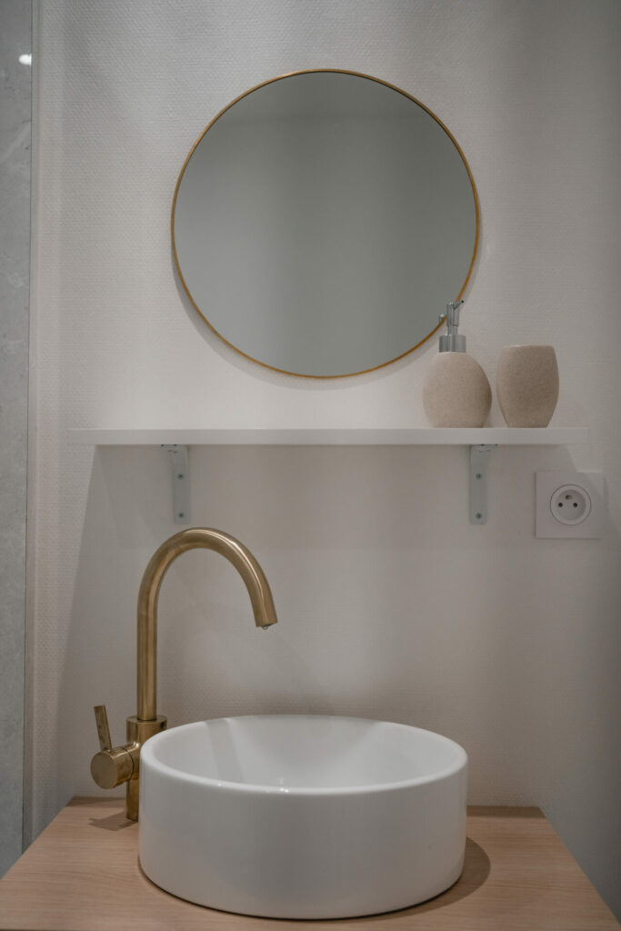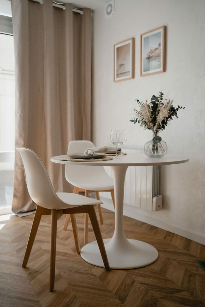 Un vrai défi de tout faire tenir dans 25m2 mais on y trouve un salon/salle à manger, une cuisine, un espace nuit, une salle de bain ET un spa ! . Une décoration naturelle, bohème avec des matériaux comme le bois, enduit à la chaux, couleurs douces et le côté chic avec l’imitation marbre et le parquet en chevron. Malgré un petit budget, nous avons réussi à donner une vrai identité à ce lieu !